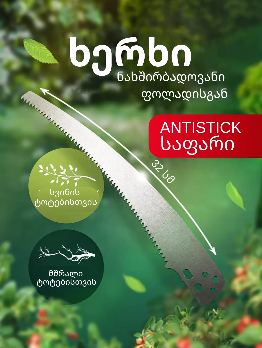 მოღუნული პირი დამზადებულია მაღალი ხარისხის ნახშირბადოვანი ფოლადისგან (SK5), არის ბასრად დაზუსტებული და აძლევს საშუალებას მოჭრათ ტოტები 25 მმ-მდე დიამეტრით. ბასრი კბილაკები უზრუნველყოფს სწრაფ და სუფთა ჭრას.